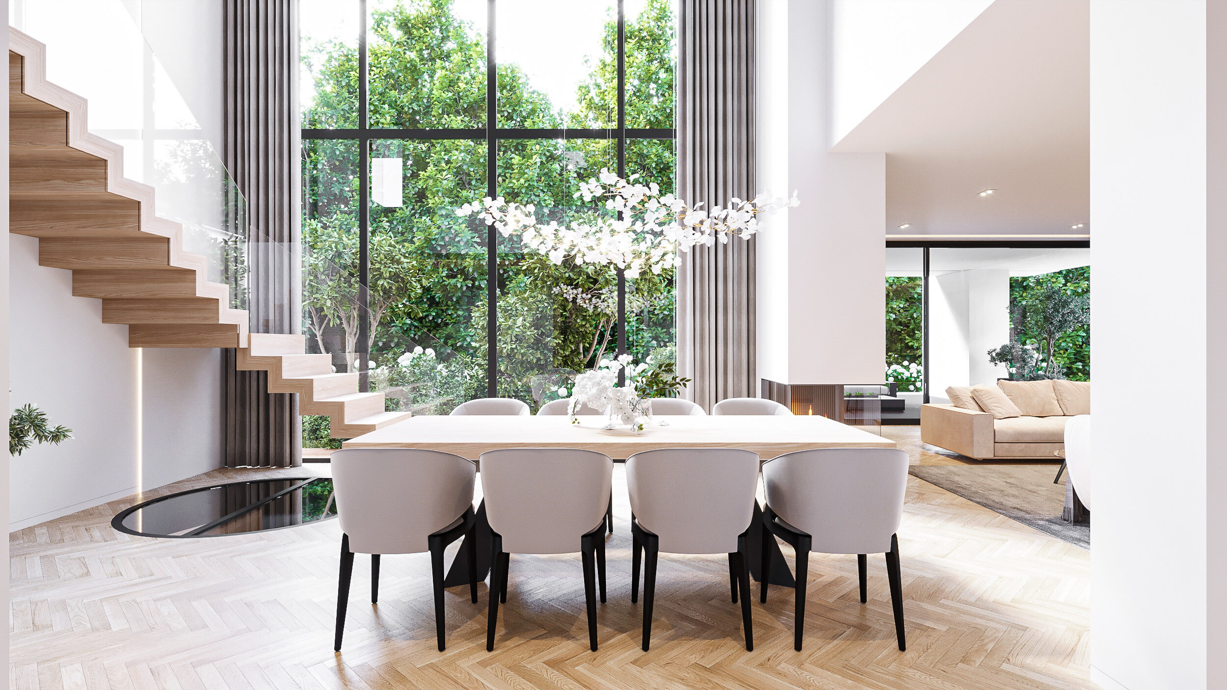 Przestronne wnętrza jadalni otwierają się na światło dzięki wysokim przeszkleniom, a designerska lampa nad stołem nadaje całej przestrzeni wyjątkowego charakteru.